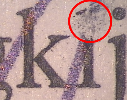 Давайте разбираться вместе. 1. Вы пишите, что «штрихи печатного текста сплошные и плотные». Скажите, пожалуйста, какой кратностью увеличения микроскопа Вы пользовались? Дело в том, что для определения «плотности» штрихов, т.е. оценки взаимораспо-ложения частиц тонера между собой, необходимо увеличение не менее 80-100х. Только при таком увеличении можно хорошо разглядеть микроструктуру штриха печатного тек-ста, выполненного тонером, чтобы избежать варианта «дырчатой» структуры (рис.1) либо наличия дефекта в штрихах в виде «раковин» (рис.2). Рис.1