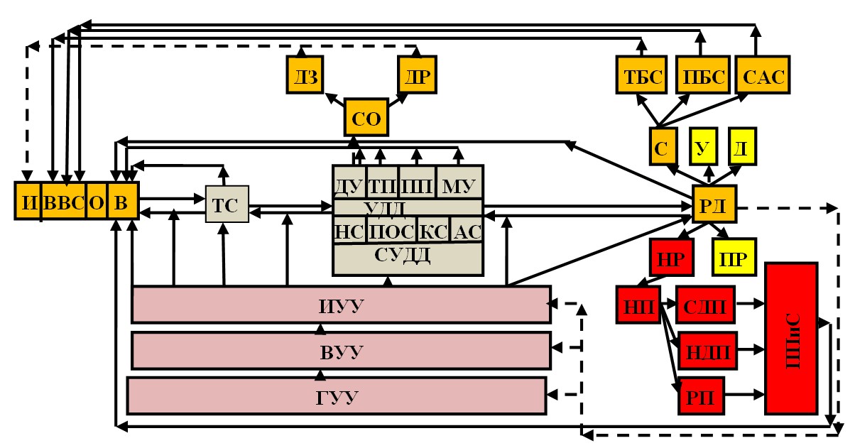 Рис. 1. Факторы, влияющие на автомобильно-пешеходное столкновение: И – информирование водителя об условиях дорожного движения; ВВС – выбор водителем скорости движения; О – образование водителя; В – водитель; ТС – транспортное средство; ДЗ – дорожные знаки; ДР – дорожная разметка; СО – скоростные ограничения; ДУ – дорожные условия; ТП – транспортный поток; ПП – пешеходный поток; МУ – метеорологические условия; УДД – условия дорожного движения; НС – нормальная ситуация; ПОС – потенциально опасная ситуация; КС – конфликтная ситуация; АС – аварийная ситуация; СУДД – ситуация условий дорожного движения; ИУУ – инженерный уровень управления; ВУУ – ведомственный уровень управления; ГУУ – государственный уровень управления; ТБС – технически безопасная скорость; ПБС – психофизиологически безопасная скорость; САС – скорость в аварийной ситуации; С – скорость; У – ускорение; Д – дистанция; РД – результат движения; НР – негативный результат; ПР – позитивный результат; НП – наезд на пешехода; СДП – скорость движения пешехода; НДП – направление движения пешехода; РП – расположение пешехода; ППиС – правоприменение и санкции; → , ‑ > – связи между элементами системы ВТСУДД