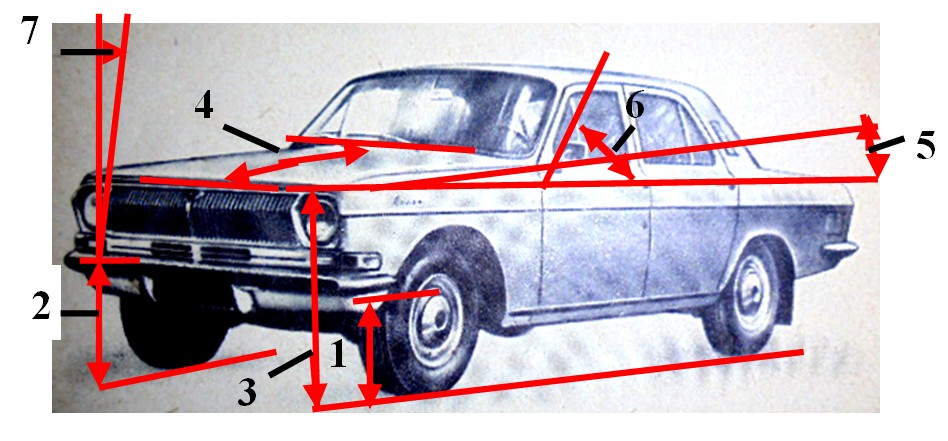 Рис. 2. Конфигурация и геометрические размеры профиля передней части ГАЗ-24 при автомобильно-пешеходном столкновении: 1 – расстояние от низа бампера до поверхности дорожного покрытия; 2 – расстояние от верха бампера до поверхности дорожного покрытия; 3 – расстояние от кромки капота до поверхности дорожного покрытия; 4 – длина капота; 5 – угол капота; 6 – угол ветрового стекла; 7 – угол отклонения лобовой части автомобиля от вертикали