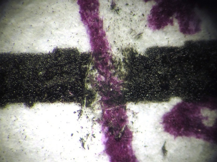 Результаты проведённых экспериментов свидетельствуют о том, что в ряде случаев применяемые методы дают диаметрально противоположные результаты, что может привести к ошибочности выводов. В большинстве случаев микроскопический метод не даёт положительных результатов по установлению последовательности нанесения пересекающихся штрихов, так как текст выполнен красящим веществом чёрного тона, а штрихи оттиска, подписей – синего/фиолетового. При любых вариантах взаиморасположения штрихов будет казаться, что более тёмный штрих лежит поверх более светлого (иллюстрации 1, 2)[6]. Исключение составили чернила для гелевой ручки и паста для шариковой ручки. Эти пишущие материалы видны на поверхности печатного текста в виде характерного блеска, сгустков красящего вещества и «вдавленности» от пишущего узла прибора (иллюстрации 3, 4).